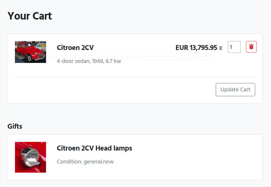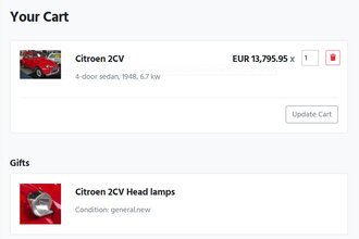 Add a red Citroen 2CV or a yellow Citroen 2CV to your cart and get a gift product for free.